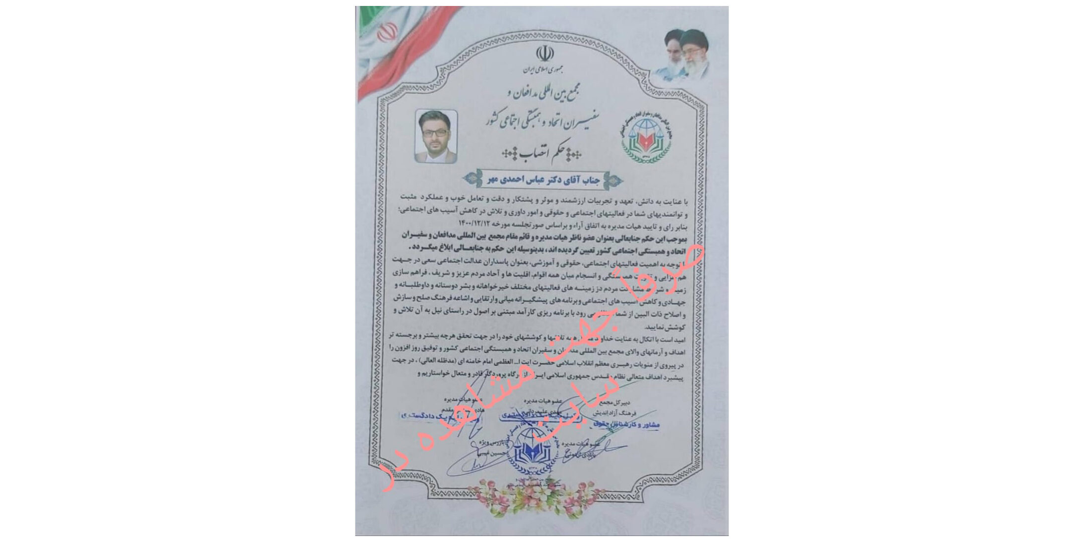 به موجب این حکم جنابعالی بعنوان عضو ناظر هیات مدیره و قائم مقام مجمع بین المللی مدافعان و سفیران اتحاد و همبستگی اجتماعی کشور تعیین گردیده اند. بدینوسیله این حکم به جنابعالی ابلاغ می گردد.